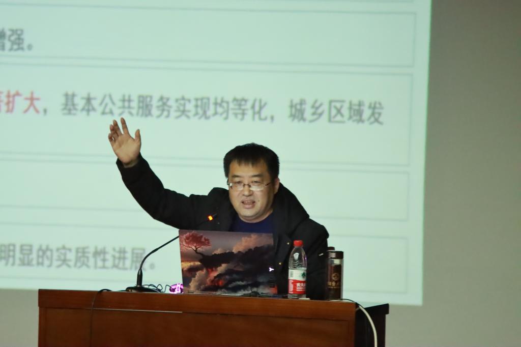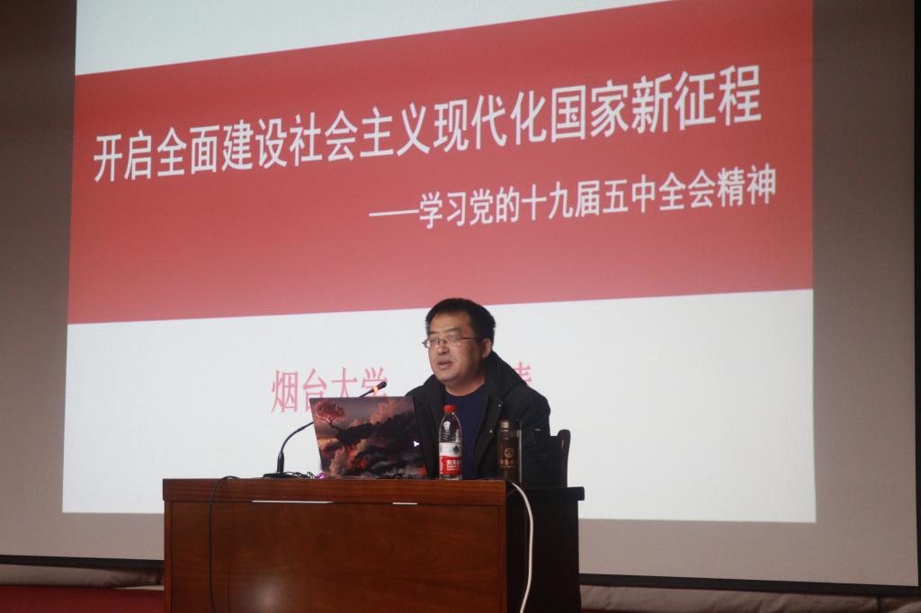 12月17日下午,省属高校学习贯彻党的十九届五中全会精神宣讲团成员、烟台大学宣讲团骨干成员刘会清教授来到我院进行党的十九届五中全会精神宣讲,主题为《开启全面建设社会主义现代化国家新征程》。宣讲会在我院一教多功能厅举行,副院长辛连军、张仁杰,院长助理莫红菊、张中华出席,全体教职员工和学生代表参与学习,宣讲会由副院长张仁杰主持。