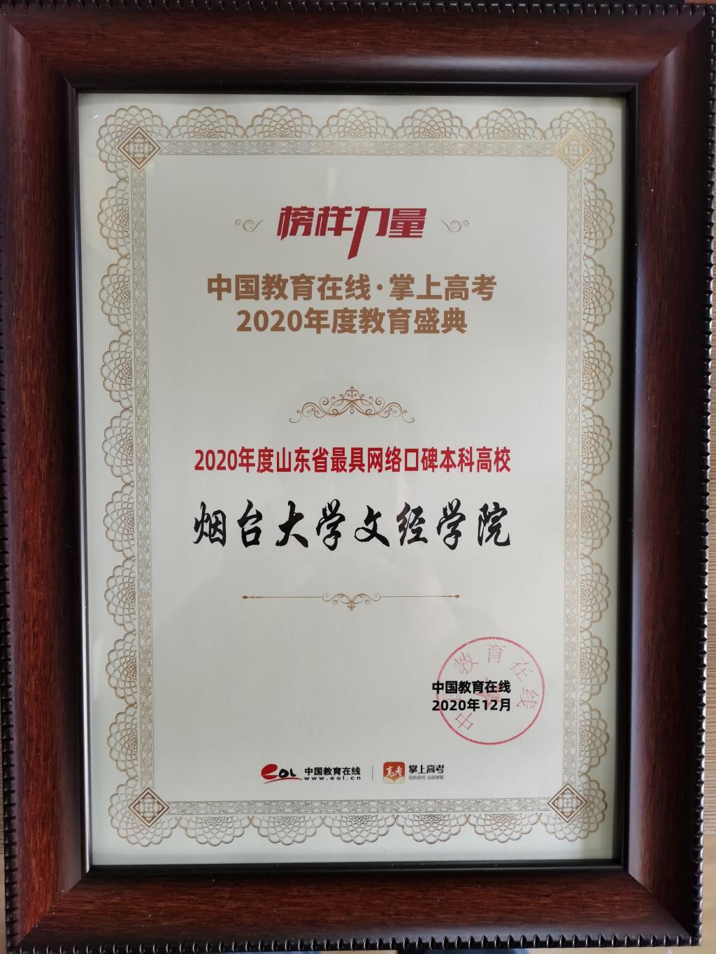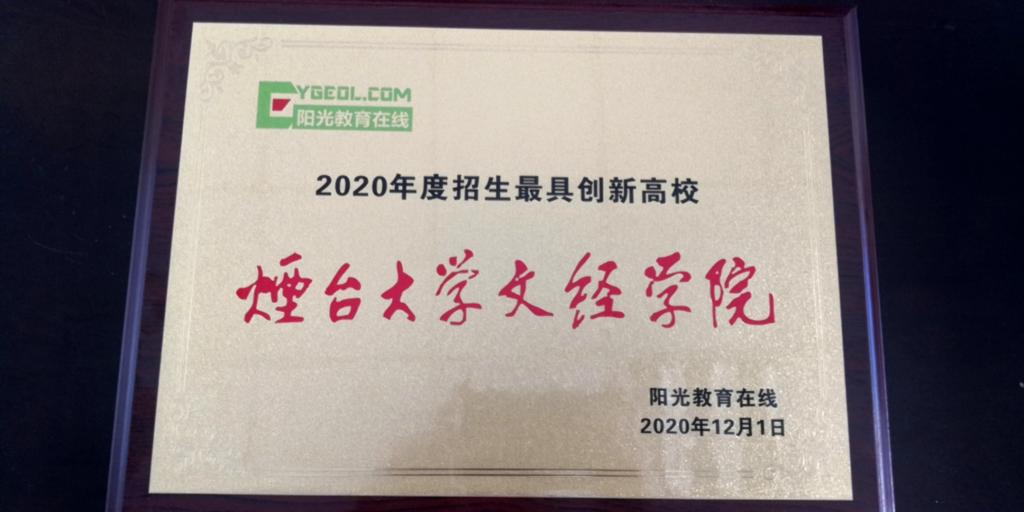 2020年,是我院招生工作,面对新形势、适应新要求,不断奋进的一年。一年来,我们不仅经受了疫情的考验,有序部署常规工作,而且不断加强融媒建设,有效结合新媒体创新招生宣传新局面,真正做到了线上有推动,线下有行动;值此岁末,我院在多家媒体举办的评奖活动中再获殊荣,其中荣获由中国教育在线颁发的“2020年度山东省最具网络口碑高校”奖,荣获由阳光教育在线颁发的“2020年度招生最具创新高校”奖。
