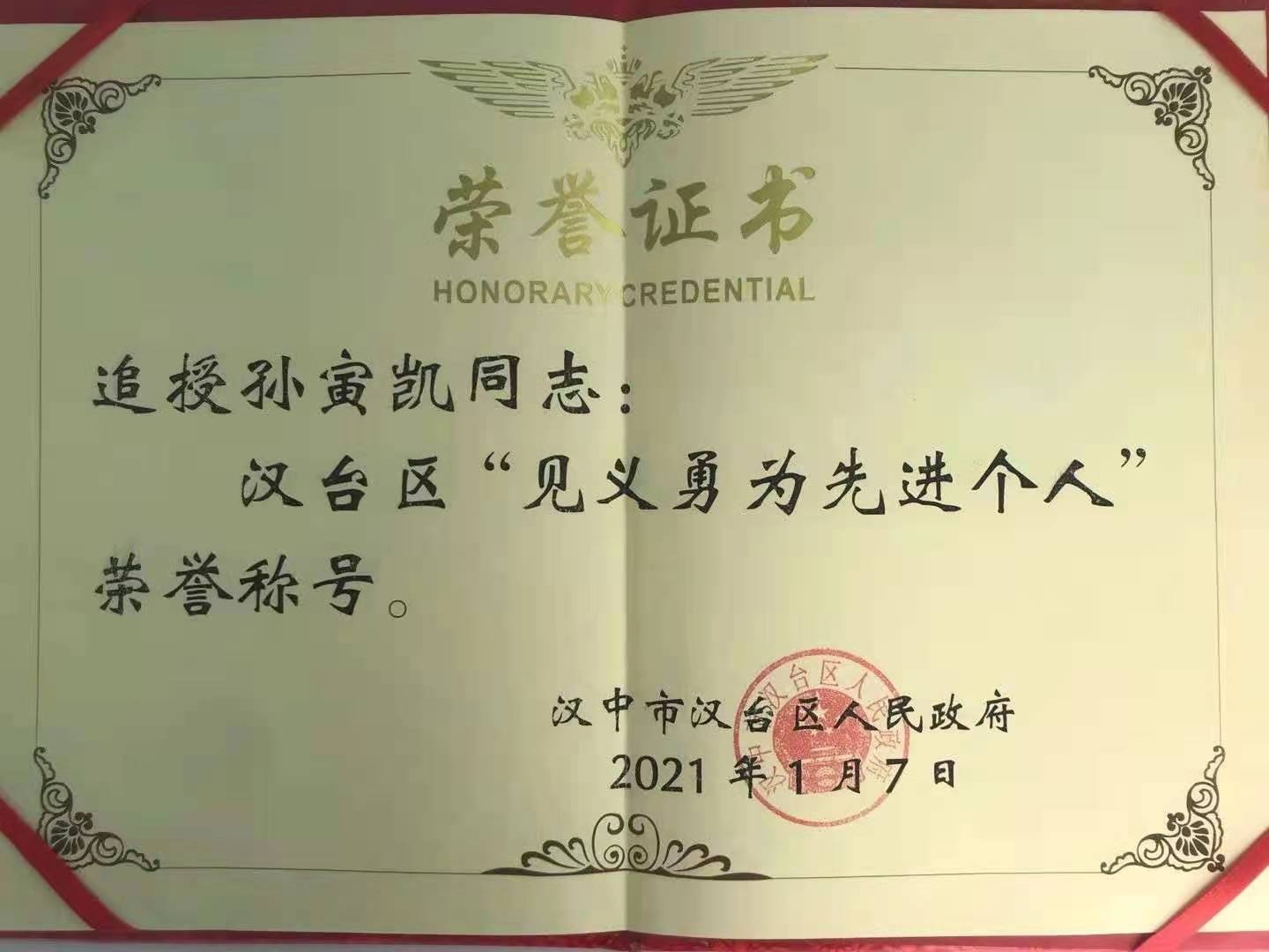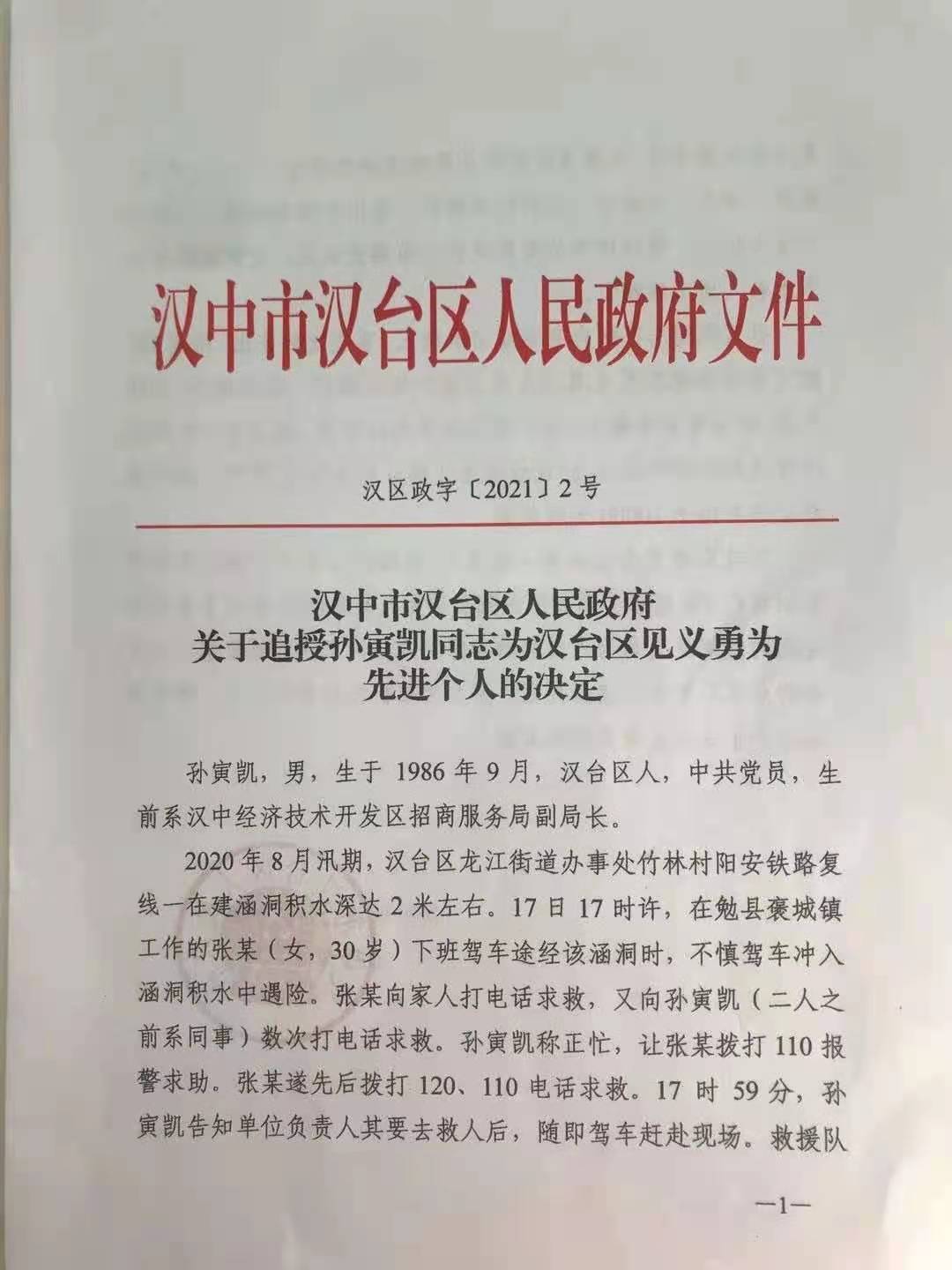 孙寅凯校友在校期间刻苦努力,积极向上;工作后勤学善思,敬业爱岗,连年被评为先进工作者和优秀公务员。2020年8月17日,因救驾车途经涵洞被困水中的前同事不幸溺亡,享年34岁。2021年1月7日,陕西省汉中市汉台区人民政府追授孙寅公凯同志为“汉台区见义勇为先进个人”荣誉称号。