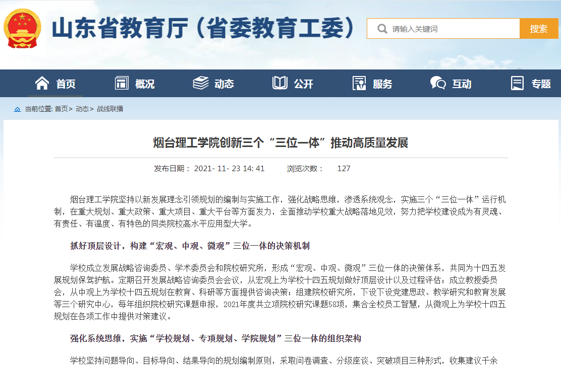 烟台理工学院坚持以新发展理念引领规划的编制与实施工作,强化战略思维,渗透系统观念,实施三个“三位一体”运行机制,在重大规划、重大政策、重大项目、重大平台等方面发力,全面推动学校重大战略落地见效,努力把学校建设成为有灵魂、有责任、有温度、有特色的同类院校高水平应用型大学。