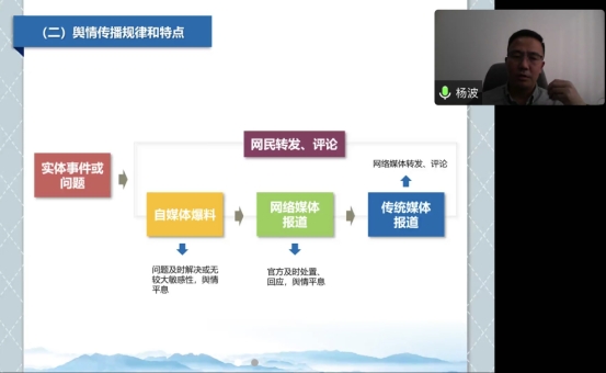 杨波主要围绕当前网络舆论特点、舆情基本内涵、应对处置网络舆情工作措施、需要注意的问题、个人体会、建议六个方面展开。他从典型案例出发,详细讲解其中舆情工作疑难点及其应对措施,分层次说明不同类型的舆情工作处理方式及其社会影响,有力分析当前网络舆情工作处境及应对措施,教授应对网络舆论工作的技巧要领。