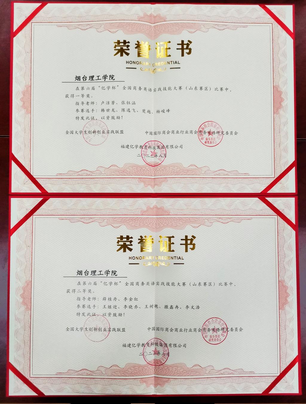 今年6月,我校外国语学院派出两支队伍参加第六届“亿学杯”全国商务英语实践技能大赛(山东赛区)比赛,由教师卢洁芳和张钰涵指导的代表队荣获一等奖,由教师薛桂丹、李金红指导的代表队荣获二等奖。