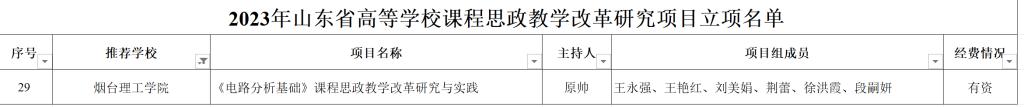 近日,山东省高等学校课程思政研究中心公布了2023年度山东省高等学校课程思政教学改革研究项目立项名单,我校信息工程学院原帅副教授主持的“《电路分析基础》课程思政教学改革研究与实践”课题获批有资立项,这是我校在省部级课程思政教学改革中的新突破,在同类院校中是唯一获批有资立项的高校。