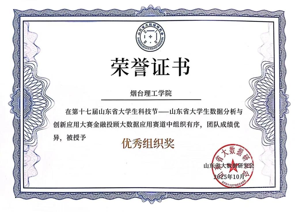 近日,第十七届山东省大学生科技节——山东省大学生数据分析与创新应用大赛金融投顾大数据应用赛道决赛圆满落幕。本次赛事由山东省科学技术协会、山东省教育厅、共青团山东省委等六部门联合主办,是全省高校范围内的高水平学科竞赛,吸引了省内众多高校的优秀队伍同台竞技。学院学子凭借扎实的专业功底和出色的团队协作能力脱颖而出,共荣获山东省二等奖一项、三等奖两项,并荣获“优秀组织奖”。
