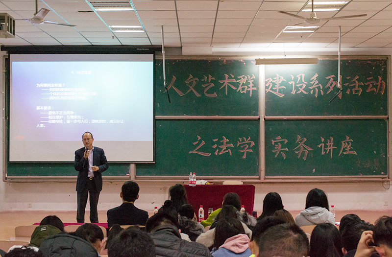 整场讲座,座无虚席,刘主任始终以儒雅的风度、渊博的知识、深厚的理论功底、严谨的专业修养和风趣幽默且联系实际的案例,为法学师生解读了律师之道的精髓。此次讲座是文法系人文艺术杯系列活动之一,是人文艺术专业群建设的重要环节;是法学专业纵深加强行业协作的重要举措;是实践教学改革与创新的重要成果;也是落实应用型法学人才培养、提高法学生的职业胜任力的重要途径和探索。