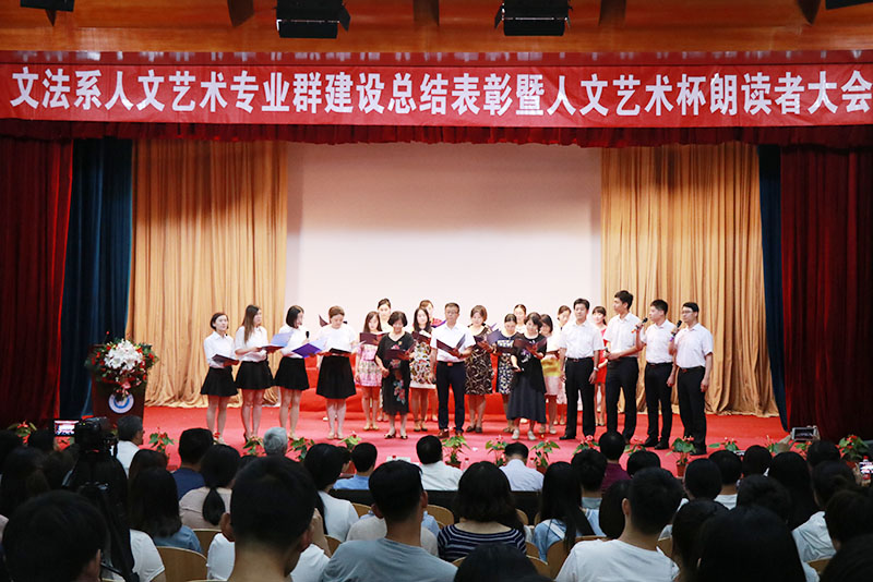 党委书记李相然宣布大会开幕,并向文法系赠送亲笔书法作品《沁园春·雪》,文法系主任汤唯、主任教授阎幸福献上开篇朗诵。随后,大会分别以师德、读书、亲情、励志四个单元为主线,朗读了《强师德、铸师魂》《第十一位教师》《奶奶的星星》《为权利而斗争》《永不放弃》《红楼梦》和《大学》片段等12组作品。在朗读者倾情热烈、感人至深的朗诵表演中,表彰了在“人文艺术杯”系列活动中获奖的教师和学生。励志篇中,院长于光辉朗读《沁园春·长沙》,并送上寄语,希望文法系学子能够在学业和今后的职业生涯中不断前行,把个人的成长发展同国家的发展需要紧密联结起来,突破“小我”、走向“大我”,在社会服务中实现自己的人生价值。“学生强,则教育强;少年强,则中国强”,文法系全体教职员工齐诵《少年中国说》选段,气势宏大,震撼全场。