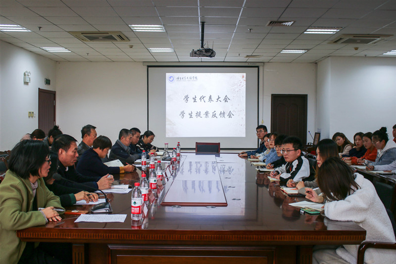为强化学院服务职能,增进师生沟通交流,切实保障学生权益,构建和谐稳定校园环境,11月20日下午,学生代表提案反馈会在二教六楼会议室召开。党委副书记李荣梅、学院管理总督导杜希成,教务部、科研素质教育部、学工部、招生就业部、对外交流合作部、图书馆、后勤部、保卫部等部门相关负责人以及院系学生代表参加会议。