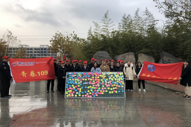 外语系与公交四公司建立了长期有好的合作基地平台,并通过多种交流形式实现同合作企业的有效接轨。对此,第四汽车公司的司机代表表示,自外语系与第四汽公司共建志愿服务基地以来,外语学子一直致力于奉献与志愿精神的发扬传承。此次感恩节活动也为外语系和汽车公司双方的交流增添了新的内涵,学生富有创意而饱含温暖的感恩活动更是温暖着公交服务群体的心,这既有利于学生表达感恩,也有利于司机师傅更好地服务同学、服务大众。公交党员司机们纷纷在挂章卷轴上进行了签字,并高举党旗同参加本次活动的外语系学生们进行了合影留念。