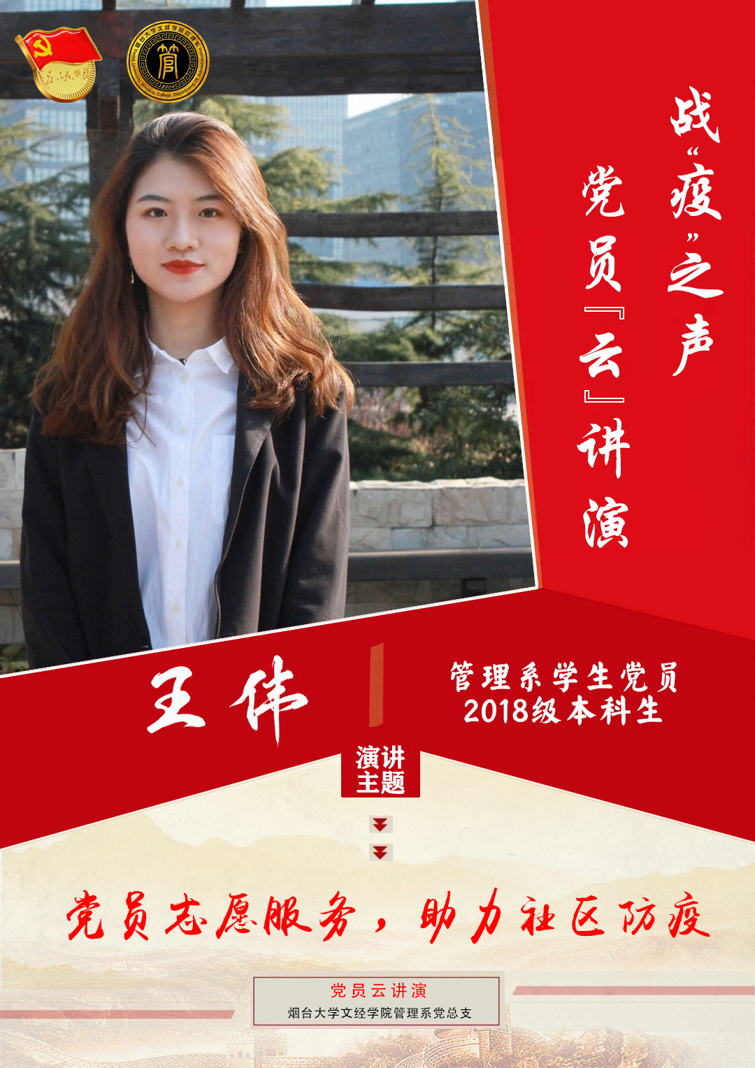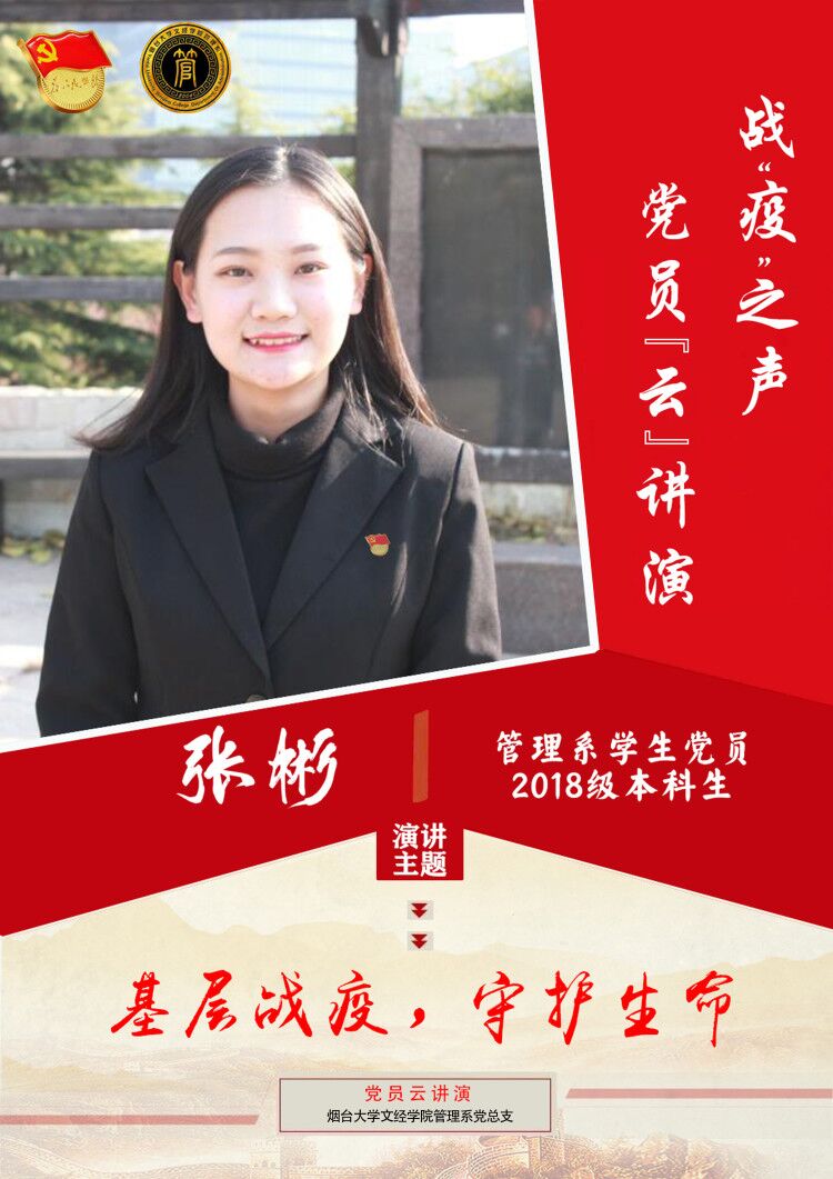 为深入贯彻习近平总书记关于新型冠状病毒感染的肺炎疫情防控工作的重要指示精神,积极响应党团组织号召,切实推进思想政治教育建设,烟台大学文经学院管理系于3月开始筹备并组织开展战“疫之声——党员云讲演系列活动,依托新媒体平台构建党员演讲云课堂,创新思政教与模式。