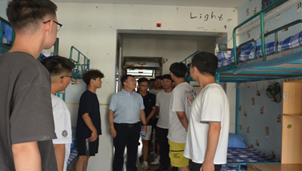 曹钊庆带领老师们开始走访宿舍,亲切地与新生们进行交谈,对他们的到来表示欢迎,并细致询问了新生们的入校感受、住宿情况等,耐心地解答同学们的疑惑与问题。每到一个宿舍,都耐心叮嘱大家注意寝室用电安全,规律作息,保持良好卫生。与此同时,他还叮嘱同学们天气炎热要多喝水,照顾好自己,注意身体健康,为即将到来的军训做好准备。希望同学们能够尽快适应大学集体生活,把宿舍当作自己的家,把同学当作亲人,营造良好的宿舍氛围。他提醒大家要做好大学期间的人生规划,制定合理的目标和科学的方案。