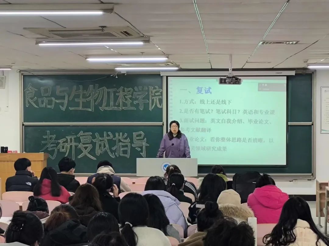 为扎实推进考研复试指导工作,帮助同学们掌握复试技巧,助力我院学子在复试中取得优异成绩,3月12日晚19:00,学院于二教307开展考研复试指导讲座,食品与生物工程学院副院长高娜主讲,辅导员孙钰涵及2024级全体考研学子参加本次讲座。