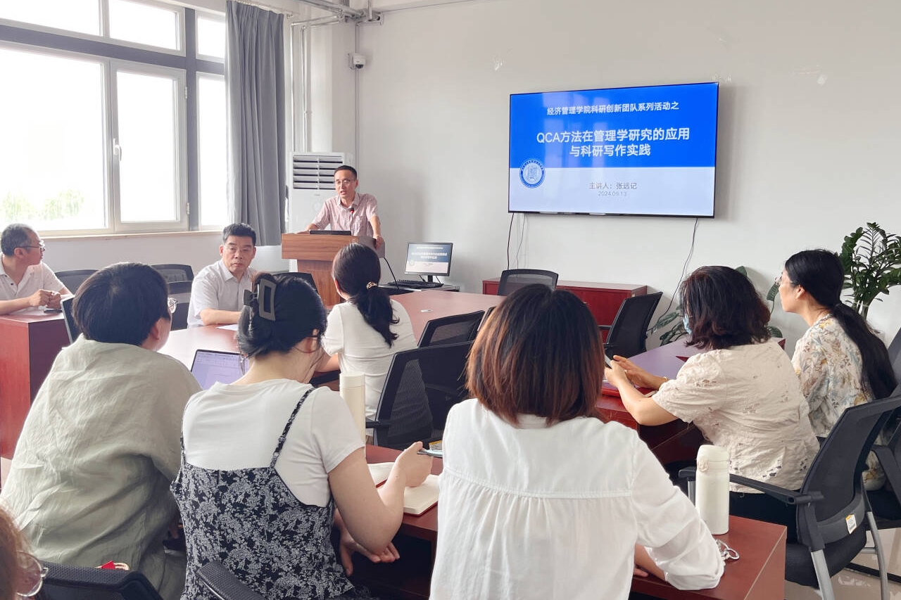 为提高专任教师的科研能力和水平。9月13日,经济管理学院举办了一场主题为“QCA方法在管理学研究的应用与科研写作实践”的学术研讨会,本次研讨会是学院科研创新团队成立以来的首次学术交流。不仅是对科研写作质量提升的一次积极探索,更是学院在合格评估、学科建设和申硕准备等关键领域的重要举措。研讨会由经济管理学院学术院长李中东主持,张远记教授主讲,科研创新团队全体成员、专任教师,以及会计与金融学院的部分教师参与了此次学术活动。